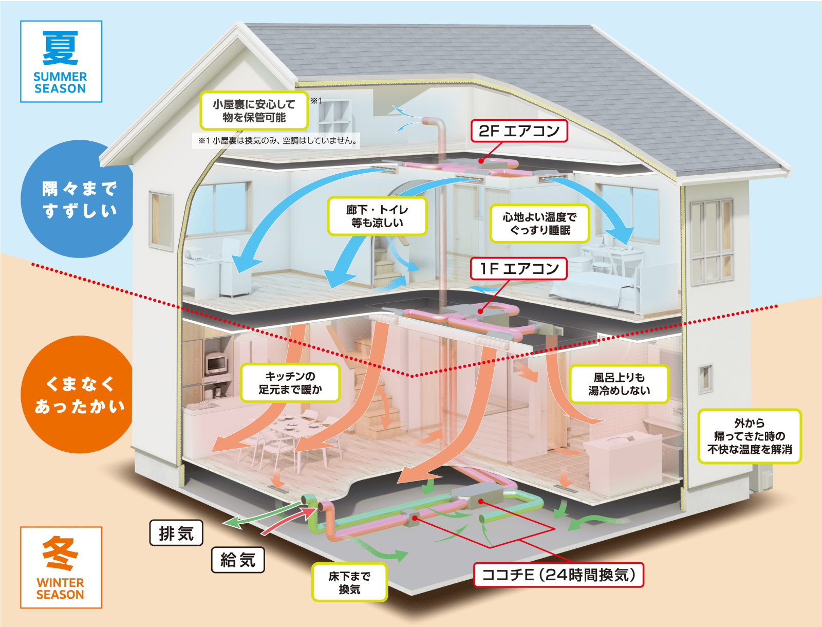 経済的な運用: 初期導入費用は一般的な全館空調の約半額で、月々の電気代も抑えられます。例えば、東京都区部や横浜、千葉市では、月々平均2,000円ほどの節約が報告されています。